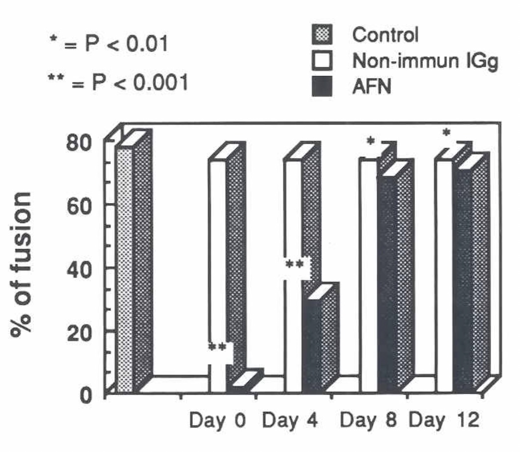 Fig. 13. Chart showing the cell fusion rate at day 16 in Xenopus satellite cell cultures to which antlfibronectin IgG (AFN) or non-immune fgG were added at different times.