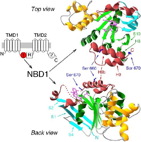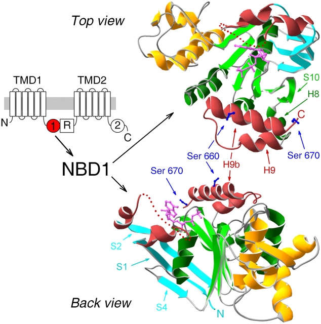 Figure 1. . Crystal structure of NBD1 of murine CFTR. (Left) Domain topology of CFTR comprising two transmembrane domains (TMD1 and 2), two cytoplasmic nucleotide binding domains (NBDs, marked 1 and 2), and unique cytosolic R domain. (Right) Ribbon diagrams (created using Swiss-PdbViewer v3.7b2) of crystal structure of mouse CFTR NBD1 with bound MgATP (Lewis et al., 2004; accession code 1R0X), in two orientations: top, view from the side of the ATP-binding pocket (top view); bottom, view from an angle roughly perpendicular to the top and along the plane of the F1-like parallel β-sheet (back view). Color coding: ABC-specific NH2-terminal antiparallel β-sheet, cyan; F1-like ATP-binding core, green; ABC-specific α-helical domain, gold; nonconserved insertion and extension, red; ATP, magenta; side chains of serines 660 and 670, blue. Dotted red line within the nonconserved insertion represents disordered residues 412–428, not resolved in the crystal structure, and is simply intended to indicate the continuity of the peptide chain. β-Strands and α-helices discussed in the text are marked by arrows.