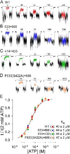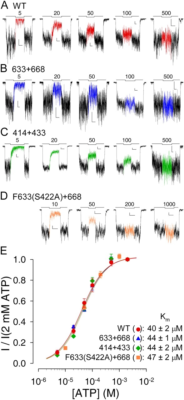 Figure 3. . ATP dependence of macroscopic current is intact for severed CFTR constructs. Currents from macropatches containing (A) WT, (B) 633+668, (C) 414+433, and (D) Flag-tagged 633(S422A)+668 channels superfused with test concentrations of MgATP ranging from 5 μM to 1 mM, bracketed by exposures to 2 mM MgATP (bars; numbers indicate test [ATP] in μM). L-shaped scale bars in each panel indicate 2 pA and 10 s. (E) Mean currents in test [MgATP], normalized to the average of the currents in the 2 mM MgATP bracketing segments, plotted against test [ATP]. Lines show fits to the Michaelis-Menten equation, giving Km values printed.