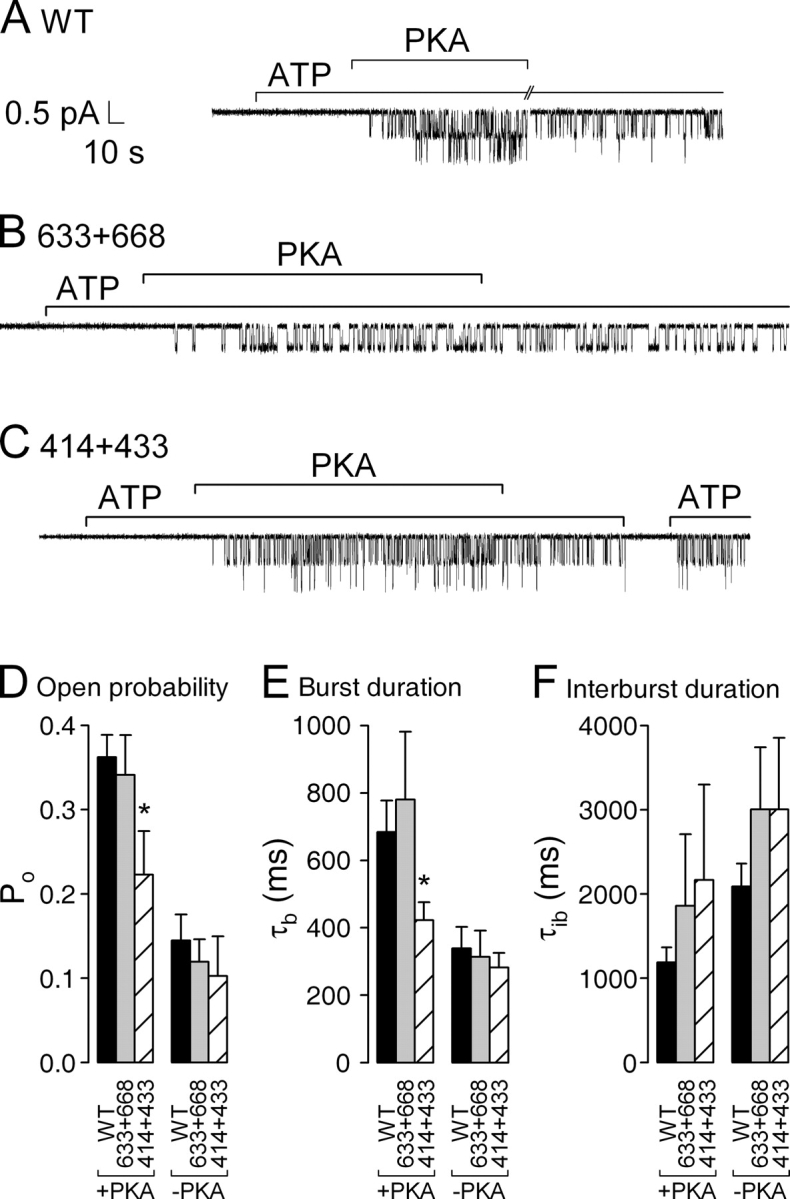 Figure 4. . Single-channel kinetics in the presence of PKA and following its removal. Patches containing (A) two WT, (B) a single 633+668, or (C) two 414+433 channels were superfused with 2 mM MgATP; after ∼1 min 300 nM PKA catalytic subunit was transiently added (bars). Note absence of openings during exposure to ATP alone, before addition of PKA. (D) Open probabilities, (E) mean burst (τb), and (F) interburst durations (τib), in the presence of PKA+ATP (left) or in just ATP after PKA removal (right), extracted from multichannel patches (materials and methods). Po and τb values in PKA are given in the text; τib in PKA was 1190 ± 177 ms (n = 11) for WT, 1861 ± 850 ms (n = 5) for 633+668, and 2165 ± 1136 ms (n = 6) for 414+433. After PKA removal, Po was 0.14 ± 0.03 (n = 7), 0.12 ± 0.03 (n = 4), and 0.10 ± 0.05 (n = 5); τb was 339 ± 64 ms (n = 8), 314 ± 77 ms (n = 6), and 282 ± 44 ms (n = 10); and τib was 2090 ± 268 ms (n = 7), 3004 ± 736 ms (n = 4), and 3005 ± 847 ms (n = 5) for WT, 633+668, and 414+433, respectively. Asterisks in D and E indicate significantly smaller Po (P = 0.017) and significantly shorter bursts (P = 0.03), respectively, for 414+433 compared with WT.