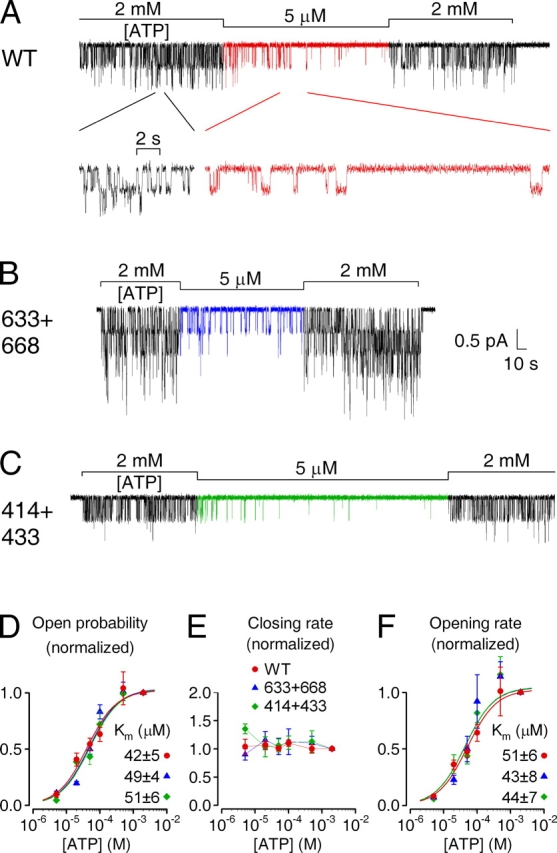 Figure 5. . ATP dependence of single-channel gating kinetics is intact for severed CFTR constructs. Currents from patches with few active (A) WT, (B) 633+668, and (C) 414+433 channels exposed to 5 μM MgATP, bracketed by superfusion with 2 mM MgATP (bars). Note prolonged closed (interburst) periods in 5 μM ATP, evident in the inset with expanded time scale in A. (D–F) Mean burst (τb) and interburst (τib) durations were extracted (materials and methods) from segments of record in various [ATP], and closing and opening rates defined as 1/τb and 1/τib. Po (D), closing (E) and opening rates (F) in test [ATP], normalized to the average of the same parameters in the bracketing control segments, are plotted against [ATP]. Curves show fits of Po (D) and opening rate (F) to the Michaelis-Menten equation, giving Km values printed.