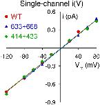Figure 7. . Single-channel conductance is unaltered in severed-NBD1 constructs. Representative examples of single-channel current–voltage (I–V) relationships in symmetrical 140 mM Cl− for WT, 633+668, and 414+433 CFTR channels. Slopes of straight lines fitted by linear regression yield single-channel conductances; mean values are given in the text.