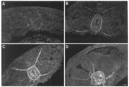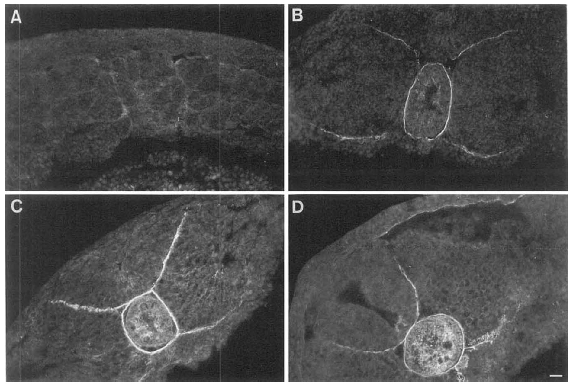 Fig. 6 A-D. Distribution of laminin during development. A-D Indirect immunofluorescence staining for laminin on sections of embryos,