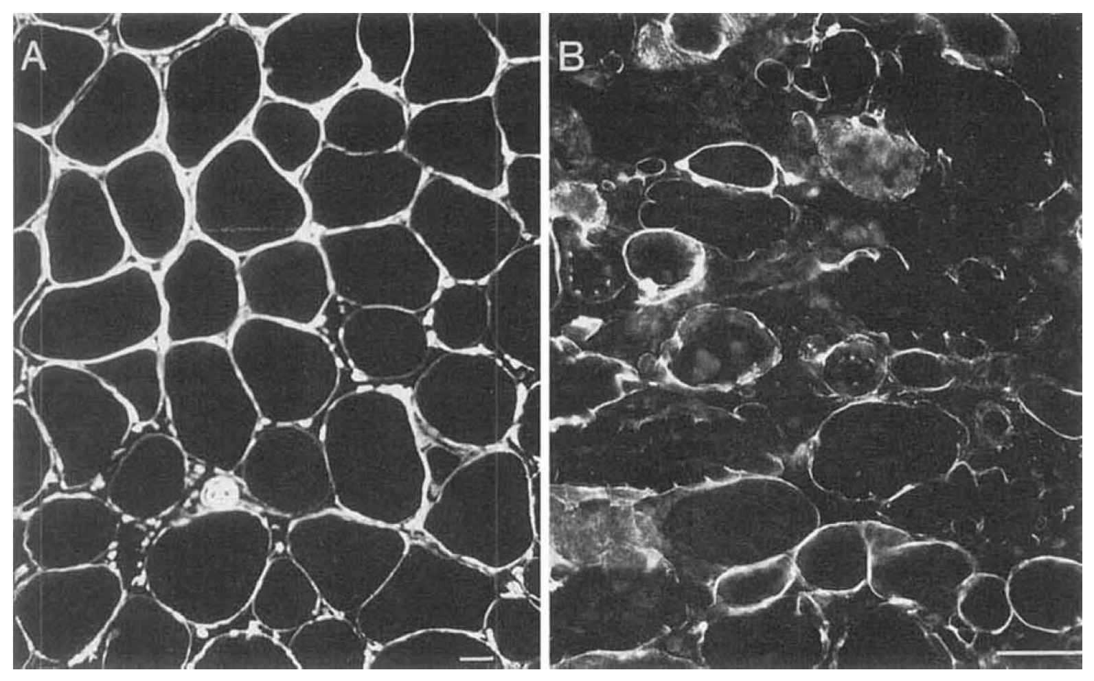 Fig. 3A, B. Tissue-specific distribution of laminin in muscle and kidney. Indirect immunofluorescence staining for laminin in 10-pm