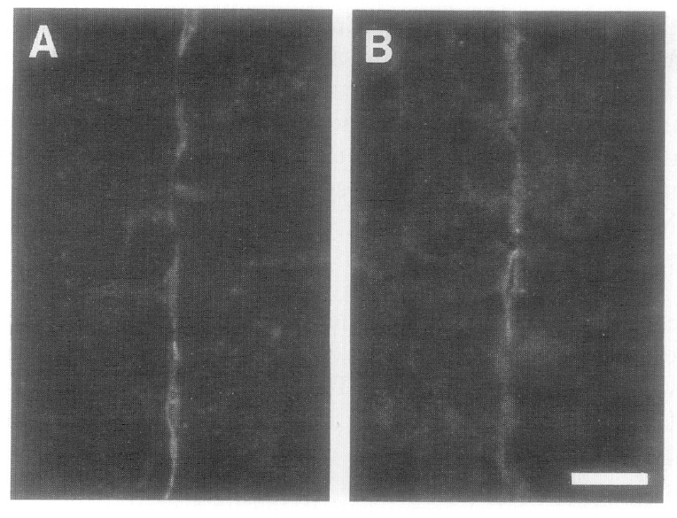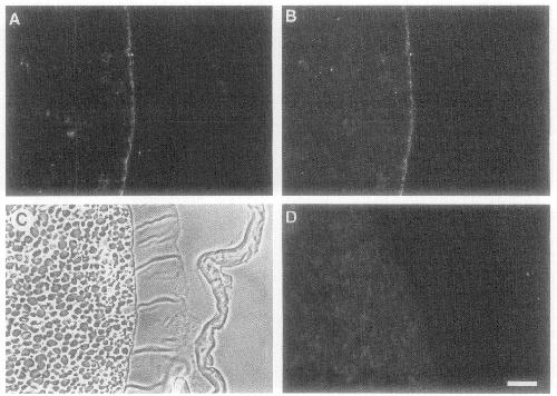 shows the corresponding phase-contrast image; panel D shows a similar section treated with nonimmune serum. Bar = 28 pm.