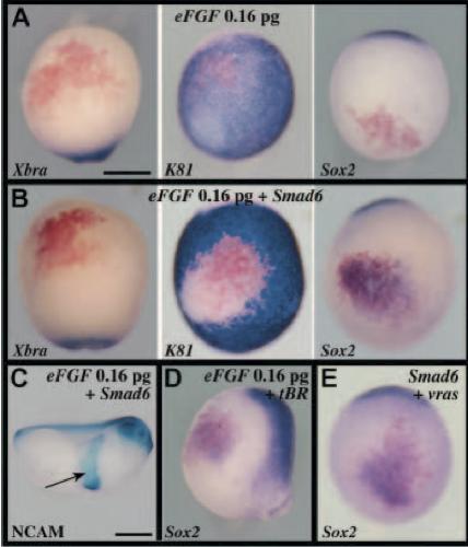 Fig. 2. Neural induction in vivo by combined FGF signalling and BMP inhibition. (A-E) Sixteen-cell embryos were injected in one ventral-most animal blastomere with lacZ and 0.16 pg eFGF (A); lacZ, 0.16 pg eFGF and 1 ng Smad6 (B,C); lacZ, 0.16 pg eFGF and 200 pg tBR (D); or lacZ, 1 ng Smad6 and 1 pg v-ras RNAs (E). Low eFGF or activated ras signalling induces neural tissue, without Xbra- positive mesoderm, when combined with BMP inhibition in late gastrula stage 13 embryos. NCAM immunostaining at tailbud stage confirms the stable neural character of the induced tissue (arrow in C). (A,B,E) Ventral view, anterior towards the top; (C) lateral view, anterior towards the right; (D) lateral view, anterior towards the top. Scale bars: 500 μm. |