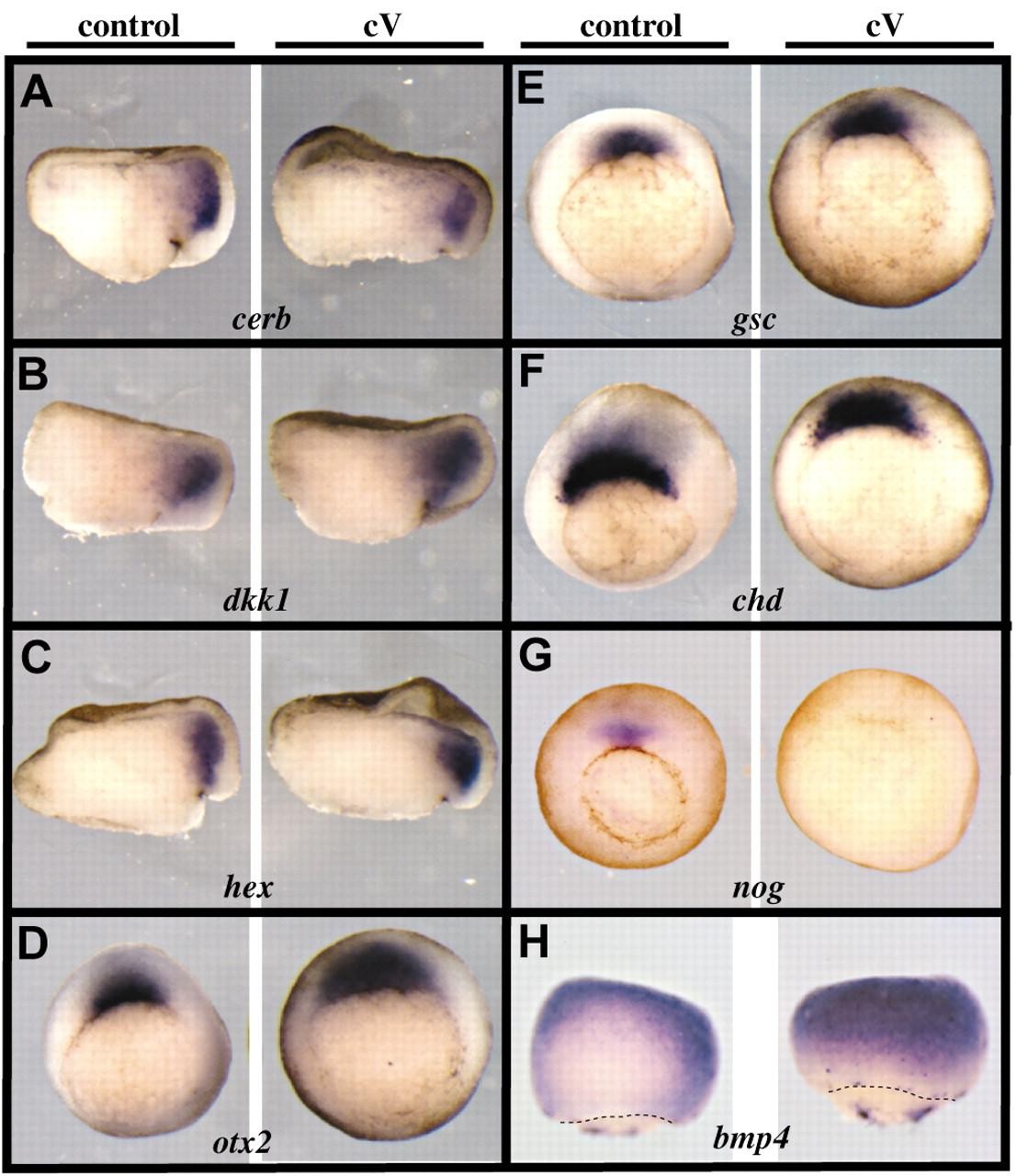 Fig. 7. Organiser gene expression in FGFR-deficient embryos. (A-H) Four-cell embryos were treated with 80 μM SU5402 until early gastrula stage 10.5 and fixed for in situ hybridisation. This treatment yielded class V embryos. In A-C, embryos were cut in two halves along the dorsoventral midline prior to hybridisation in order to improve probe penetration. The organiser genes cerberus (cerb; A), dickkopf1 (dkk1, B), hex (C), otx2 (D), goosecoid (gsc; E) and chordin (chd; F) are normally expressed in class V embryos, whereas noggin (nog; G) is not. Conversely, the epidermis inducer bmp4 is ectopically expressed in the dorsal ectoderm of class V embryos (H). Thus, BMP signalling is probably upregulated in prospective neural tissue in absence of FGF activity. (A-C) Dorsal towards the right. (D-G) Vegetal view, dorsal towards the top. (H) Dorsal view, anterior towards the top, broken lines indicate the blastopore. |