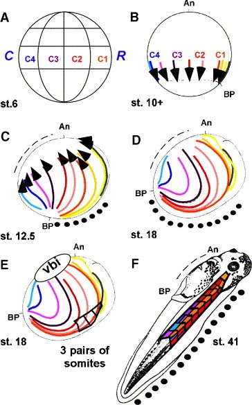 Fig. 6. Re-analysis of Keller's gastrula-to-tailbud fate map demonstrates a rostral-to-caudal progression running from the prime meridian to the sperm entry point. The pertinent blastomeres, C14, are indicated in different colors on the diagram of a st. 6 embryo in A. C1 is orange; C2 is red; C3 is purple and C4 is blue. These four blastomeres form much of the marginal zone of an early gastrula, the stage mapped by Keller. In panel B, the lines of cells Keller marked are indicated by arrows of different shades of the four colors used for the st. 6 embryo in panel A, except that the grey, yellow and orange lines all descend primarily from blastomere C1. The polarity of the marked lines of cell is indicated by the arrows. The arrowheads mark the prospective ventral mesoderm, which crawls along the roof of the blastocoel before differentiating as ventral mesoderm. In panel C, the emerging dorsal midline, which forms as the blastopore (bp) closes over the yolk plug, is indicated by a dotted line. The blastopore has crossed the vegetal pole but remains open. Large dotted and dashed lines indicate the emerging dorsal and ventral midlines of the body plan, respectively. In panel D, the blastopore has closed near the former lower lip and the dorsal midline, indicated by the dotted line, is much longer than the ventral midline because dorsal mesoderm and neural tissues are elongating due to strong convergence extension movements. The arrowheads in the ventral mesoderm are deleted to simplify the diagrams. In panel E, the contributions from the marginal zone to the ventral blood islands (vbi) are arranged in a rostral-to-caudal progression from the C1-to-C4 blastomeres. The approximate position of the first 3 head somites is shown. They descend from cells derived from blastomeres C1 and C2. The formation of somites is complex and the diagram is meant to indicate only rostral/caudal contributions, not dorsal/ventral somite origins. In panel F, the rostral/caudal contributions from the four C blastomeres are shown in the somites of a st. 41 tadpole. Cells from the marginal zone contribute to somites in a rostral-to-caudal progression that corresponds to the order C1, C2, C3 and finally C4. See text for further explanation. |