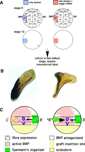 Fig. 7. Reinterpretation of the role of organizer-derived BMP antagonists and Spemann and Mangold's grafting experiment. (A) Experimental design for lineage tracing the fate of normal and noggin-expressing C4 blastomere progeny. (B) St. 6 embryos were injected with lineage tracer (black cells, embryo on left) or tracer plus noggin mRNA (black cells, embryo on right) into one C4 blastomere and cultured to st. 280. Normal C4 progeny populate caudal structures, both dorsal (somites) and ventral, much of which will end up in the tail of the tadpole by st. 41. C4 progeny expressing noggin ectopically form a secondary axis and contribute to both dorsal and ventral tissues. However, labeled cells form rostral levels of the secondary axis and continue into the tail, because of mediolateral intercalation. The presence of cells at rostral positions of the secondary axis indicates that cells have been incorporated into axial structures precociously, and hence are ostralizedrather than orsalized (C) Formation of an ectopic, secondary axis following an organizer-derived graft. C4 progeny exposed to an organizer graft form axial structures precociously, and start a second site of mediolateral intercalation (Lane et al., 2004). Thus, two sets of trunk structures are initiated and merge into a single tail, but only the endogenous axis forms a head. |