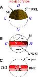 Fig. 8. Three chordate fate maps. In the ascidian fate map (A), and the amphioxus fate map (B), the R/C axis runs across the equator from the notochord field (brick red) to the muscle/somite field (red). Ventral mesoderm in shown in pink, and neural tissue is shown in blue. In the Xenopus fate map (C), this dimension has historically been called D/V, but new mapping data indicates it is the previously unassigned R/C axis. Similarities in the three maps are discussed in the text. |