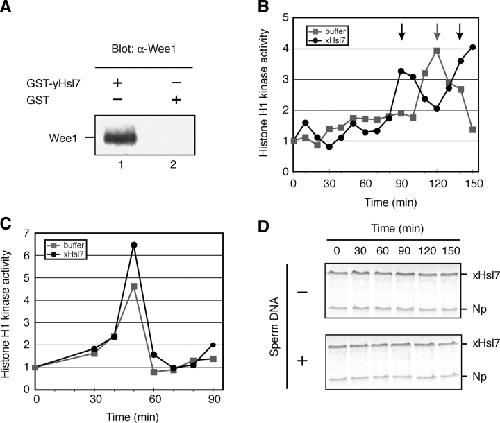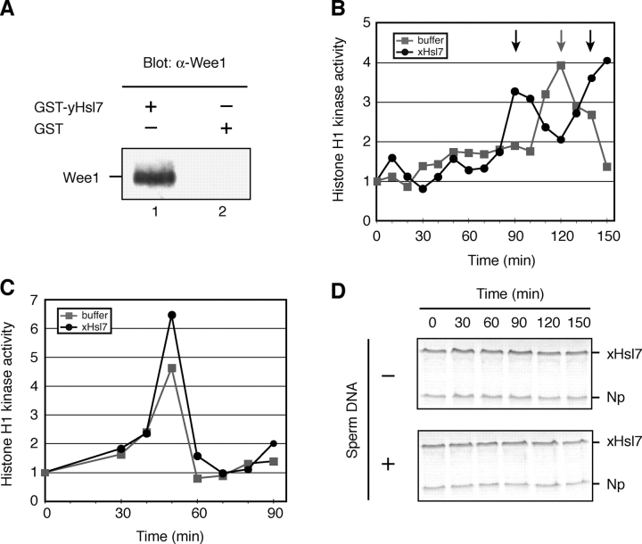 Figure 2. Excess xHsl7 accelerates entry into mitosis in a nuclear-dependent manner. (A) GST-yeast Hsl7 (lane1) or GST (lane 2) were incubated in Xenopus egg extracts, retrieved on glutathione Sepharose, and immunoblotted with anti-Wee1 antibodies. (B) xHsl7-encoding mRNA or buffer was incubated in cycling extracts with sperm nuclei (5,000/μl) and an ATP-regenerating system. Aliquots were stored at the indicated times and assayed for their ability to phosphorylate histone H1 in the presence of [32P]ATP. Phosphorylated histone was resolved by SDS-PAGE, subjected to autoradiography, and quantified by phosphoimager with the zero time point normalized to 1. Square, buffer; circle, FLAG-xHsl7 mRNA addition. Arrows indicate the time of the nuclear envelope break down and the chromosome condensation as monitored by microscope. (C) Same assay as panel B except that sperm nuclei were absent. (D) In vitro–translated 35S radiolabeled xHsl7 and nucleoplasmin (as an internal control) were added to cycling extracts with or without nuclei present. Samples were withdrawn at the indicated times, resolved by SDS-PAGE, and subjected to autoradiography to monitor xHsl7 stability. Mitosis was observed at 90 min by fluorescence microscopy of extracts containing Hoechst-stained nuclei.
