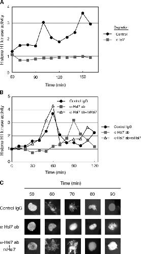 Figure 4. Blocking xHls7 function delays mitotic entry. (A) Cycling extracts were depleted with antibodies directed against xHsl7 (square) or with control mouse IgG (circle). Depleted extracts were incubated at room temperature with sperm chromatin and an ATP-regenerating system, and cell cycle progression was monitored by measuring Histone H1-directed kinase activity, beginning at 60 min when both extracts were still in interphase, as detected by fluorescence microscopy of Hoechst-stained nuclei. (B) Control IgG (closed circle), anti-Hsl7 (closed square), or anti-Hsl7 supplemented with recombinant xHsl7 (open triangle) was incubated in 100 μl of cycling extract supplemented with sperm nuclei and ATP-regenerating system. Experimental analysis was identical to Fig. 2 B. (C) Hoechst staining of DNA was monitored by fluorescence microscopy to visualize nuclear envelope breakdown and chromatin condensation.