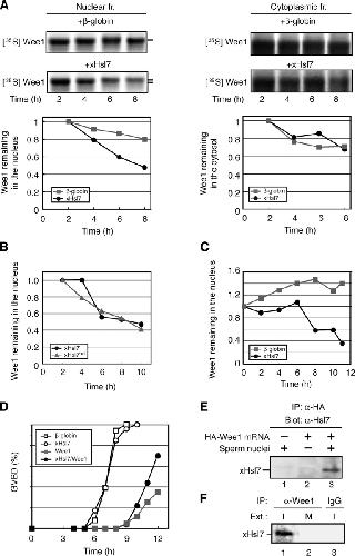 Figure 6. Hsl7 promotes intranuclear Wee1 degradation. (A) Xenopus stage VI oocytes were injected with 40 ng of β-globin or FLAG-xHsl7 mRNAs and incubated in the presence of 50 μM roscovitine. 12 h later, they were injected again with 35S-labeled Wee1 protein. After the second injection, they were treated with progesterone (1 μM) and roscovitine in modified Barth's + Ca buffer. At the indicated times after treatment, five oocytes were manually dissected into nuclear (left) and cytoplasmic (right) fractions, and analyzed by SDS-PAGE and autoradiography. The graph represents a quantitation of the data above showing the fraction of Wee1 remaining in nuclei or cytosol. Square, β-globin; circle, FLAG-xHsl7 mRNA injection. The bars to the left of the panel denote the mobility shift of Wee1. (B) 40 ng mRNAs of FLAG-xHsl7 (circle) and FLAG-xHsl7 metyltransferase mutant (triangle) were injected into oocytes. The Wee1 degradation assay was performed as described in panel A. The graph shows the fraction of Wee1 remaining in nuclei. (C) Oocytes were injected as in panel A, but after the second injection, they were treated with leptomycin B (200 nM) for 2 h. Progesterone (1 μM) was then added to induce oocyte maturation. At the indicated times after progesterone treatment, five oocytes were manually fractionated and analyzed by SDS-PAGE followed by autoradiography. The graph shows the fraction of Wee1 remaining in nuclei. Square, β-globin; circle, FLAG-xHsl7 mRNA injection. (D) The experiment in Fig. 5 A was repeated as described except that MG132 was injected into the oocytes along with the indicated mRNAs. Open square, β-globin; open circle, FLAG-xHsl7; closed square, HA-Wee1 mRNA injection; closed circle, FLAG-xHsl7 and HA-Wee1 mRNAs coinjection. (E) Buffer (lane 1) or HA-Wee1 mRNA (lanes 2 and 3) were incubated in cycling extracts in the presence (lanes 1 and 3) or absence (lane 2) of sperm chromatin. After 60 min, HA-Wee1 protein was isolated with anti-HA beads and bound proteins were analyzed by anti-Hsl7 immunoblotting. (F) Interphase (lanes 1 and 3) or mitotic (lane 2) egg extracts were incubated in the presence of sperm chromatin for 60 min, and immunoprecipitated with anti-Wee1 antibody (lanes 1 and 2) or control antibody (lane 3) bound to protein A–Sepharose beads. Immunoprecipitates were then blotted with anti-Hsl7 antibodies.