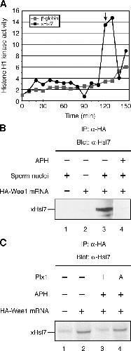 Figure 7. Excess Hsl7 overrides the DNA replication checkpoint. (A) Xenopus Hsl7 or β-globin mRNA was incubated in cycling extracts in the presence of aphidicolin (200 μg/ml). Cell cycle progression was monitored by assessing histone H1 kinase activity. Square, β-globin mRNA; circle, FLAG-xHsl7 mRNA. An arrow indicates the time of the nuclear envelope break down and the chromosome condensation as monitored by a microscope. (B) Buffer (lane 1) or HA-Wee1 mRNA (lanes 2,3, 4) were incubated in cycling extracts containing no sperm (lane 2) or sperm chromatin DNA (lanes 1, 3, and 4) in the absence (lanes 1–3) or presence (lane 4) of aphidicolin (200 μg/ml). After a 60-min incubation, HA-Wee1 protein was isolated with anti-HA beads and bound proteins were analyzed by anti-Hsl7 immunoblotting. (C) Buffer (lane 1) or HA-Wee1 mRNA (lanes 2–4) were incubated in cycling extracts containing sperm chromatin DNA in the absence (lanes 1 and 2) or presence (lanes 3 and 4) of aphidicolin (200 μg/ml) and inactive Plx1 (lane 3) or constitutively active Plx1 (T201D; lane 4). After a 60-min incubation, HA-Wee1 protein was isolated with anti-HA beads and bound proteins were analyzed by anti-Hsl7 immunoblotting.
