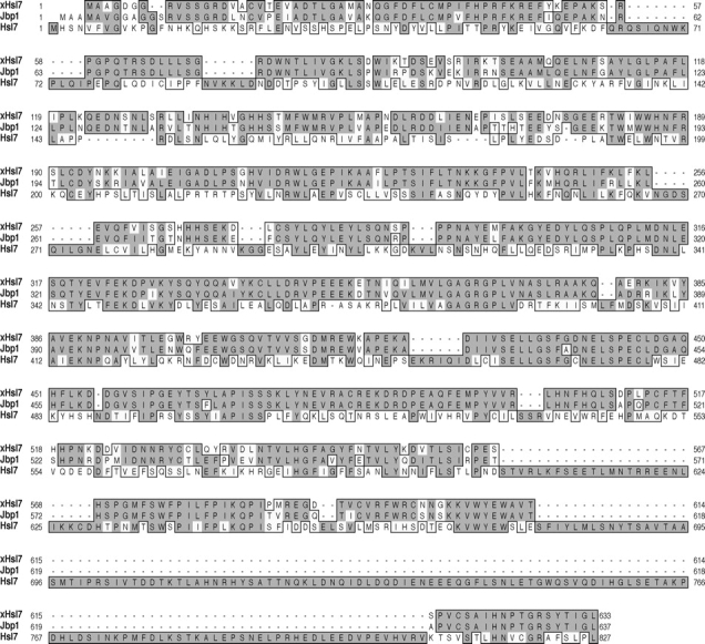 Figure 1. Amino acid sequence alignment of Xenopus, human and yeast Hsl7 proteins. The amino acid sequences of Hsl7 orthologs were aligned using the ClustalW alignment parameters in the program MacVector. Dark shading indicates identities and light shading indicates similarities.