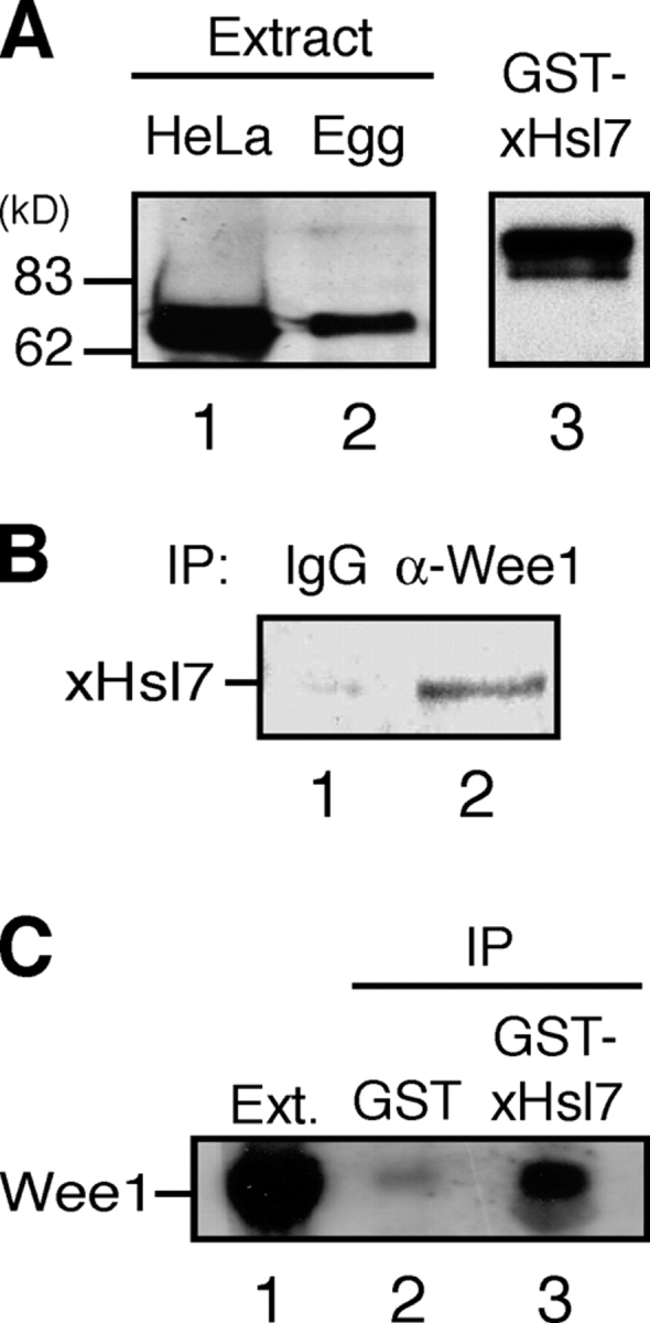 Figure 3. Xenopus Hsl7 interacts with Wee1 in Xenopus egg extracts. (A) HeLa cell lysate (10 μl), Xenopus egg extracts (2 μl), or GST-xHsl7 were resolved by SDS-PAGE and immunoblotted with anti-JBP1. (B) Immunoprecipitates formed using affinity-purified anti-Wee1 or control IgG were immunoblotted with anti-JBP1. (C) GST or GST-xHsl7 coupled to glutathione Sepharose was incubated in Xenopus egg extract and immunoblotted with anti-xWee1.