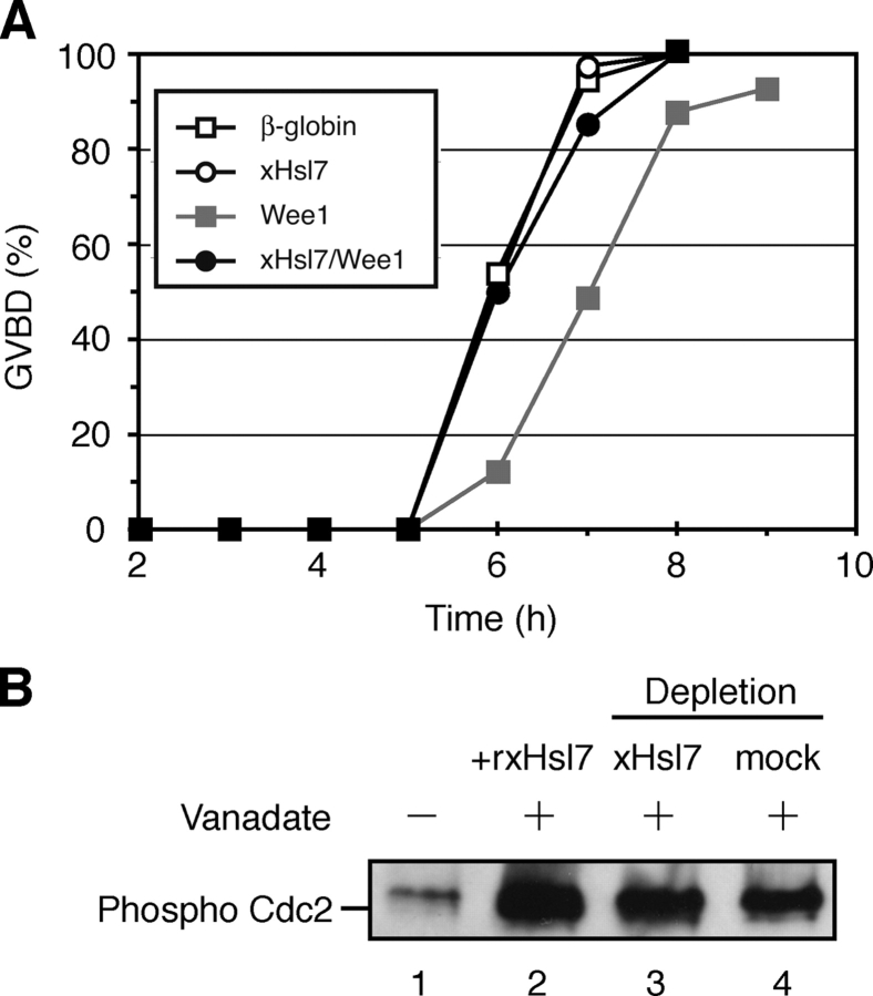 Figure 5. Excess xHsl7 restores inhibition of oocyte maturation induced by Wee1 injection and xHsl7 does not affect Wee1 kinase activity. (A) 50 stage VI oocytes were injected with 40 ng of mRNAs encoding β-globin (open square), FLAG-xHsl7 (open circle), HA-Wee1 (closed square), and 40 ng each of FLAG-xHsl7 and HA-Wee1 mRNAs together (closed circle). After a 12-h incubation, they were treated with progesterone and scored for the percentage of GVBD. (B) Ultra S Xenopus egg extract (purified cytosol) was either mock depleted, depleted of xHsl7, or supplemented with recombinant xHsl7. ATP-regenerating system was then added along with sodium vanadate to inhibit dephosphorylation of Cdc2. Recombinant human cyclin B1 was then added and the reaction was allowed to proceed for 10 min. xWee1 activity was determined by assaying the phosphorylation level of Cdc2 by immunoblotting with anti-phospo Cdc2.