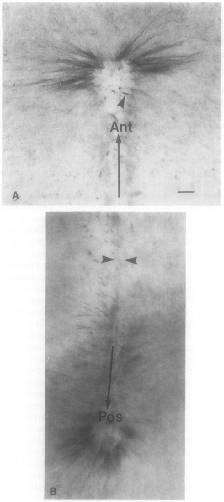 above the neural tube (short arrow). Within the neural tube lateral tract axonal processes are clearly stained (large arrow) and punctate