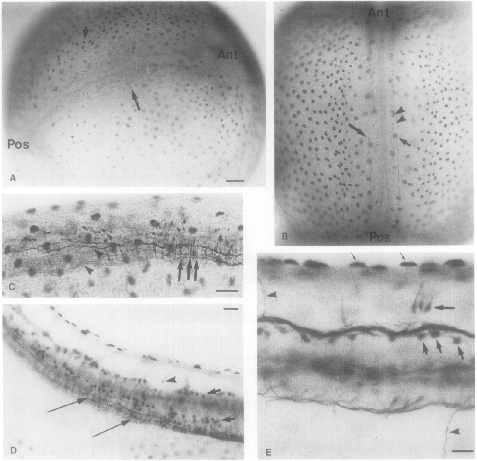 segmented myotome (marked by arrowhead). The anterior (Ant) and posterior (Pos) ends of the embryo are marked. Bar in A marks 100 pm for