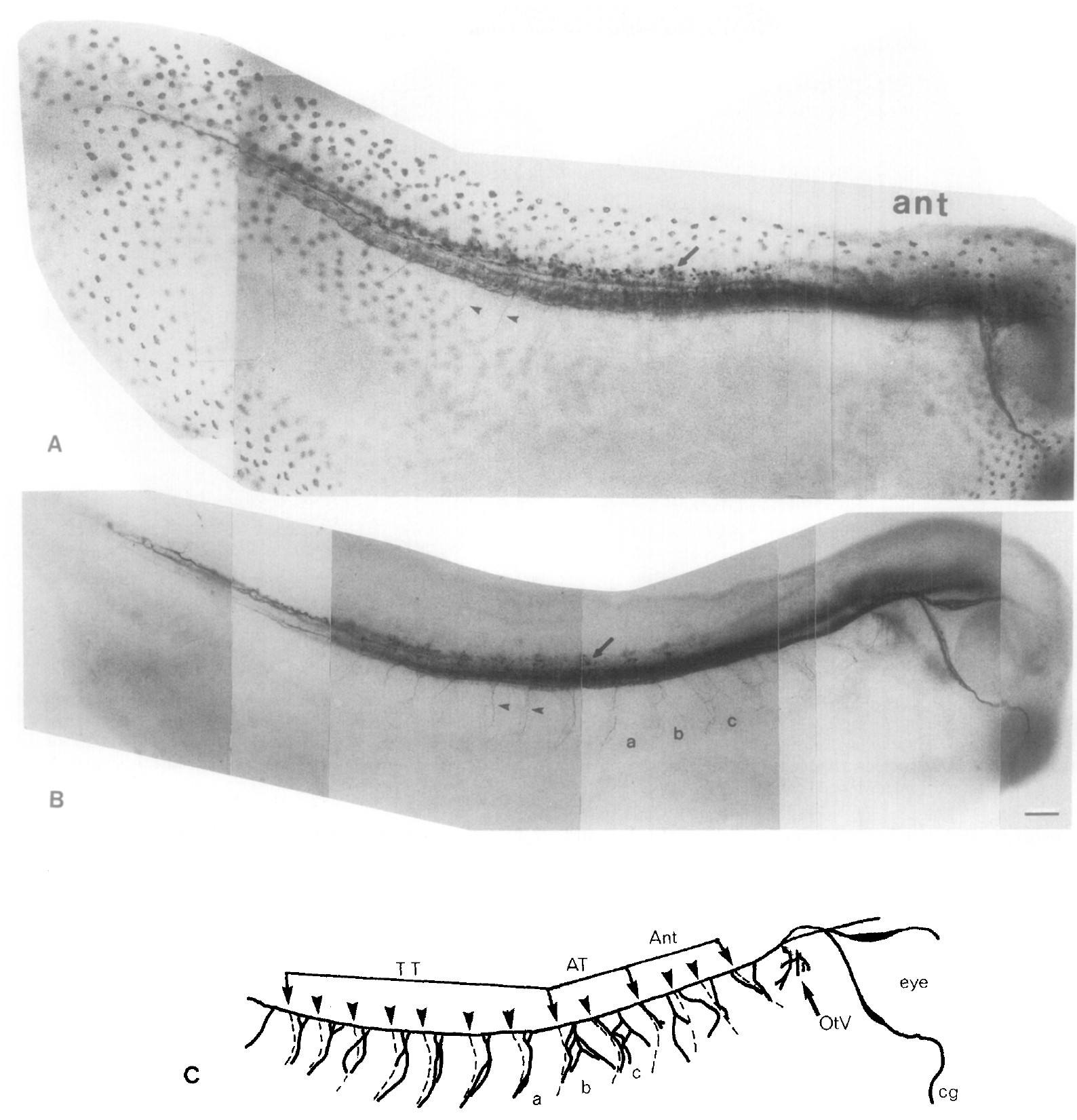 vesicle, OtV; and cement gland, cg, are marked in C. In B and C, a, b, and c correspond to the same regions shown in Fig. 9. Bar in B marks 100