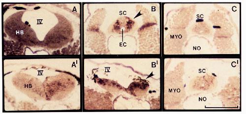XlHbox 1 protein is indicated by an arrowhead in (B) and (Bâ). Abbreviations: EC, ependymal canal; HB, hindbrain; IV, hindbrain cavity called the