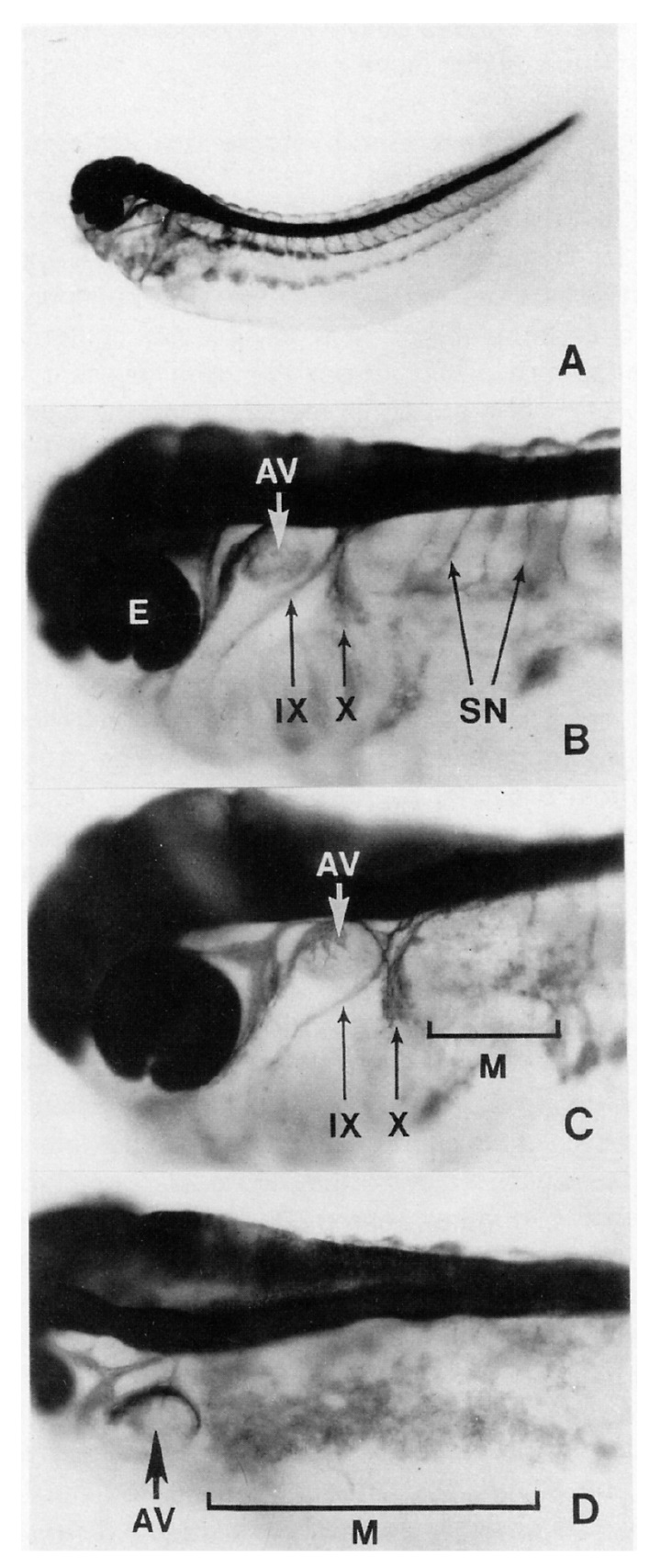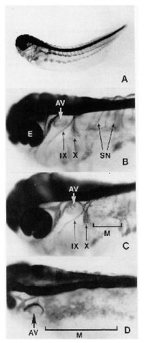 (C). Abbreviations: E, eye; AV, auditory vesicle; IX and X, ninth and