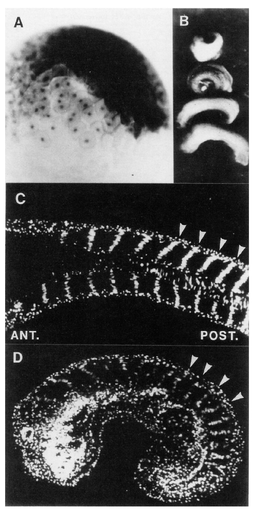 (A, A) Tadpoles were immunostained in whole mount with XlHbox 6 antibody and viewed dorsally. Specific nuclear staining is observed in the CNS,