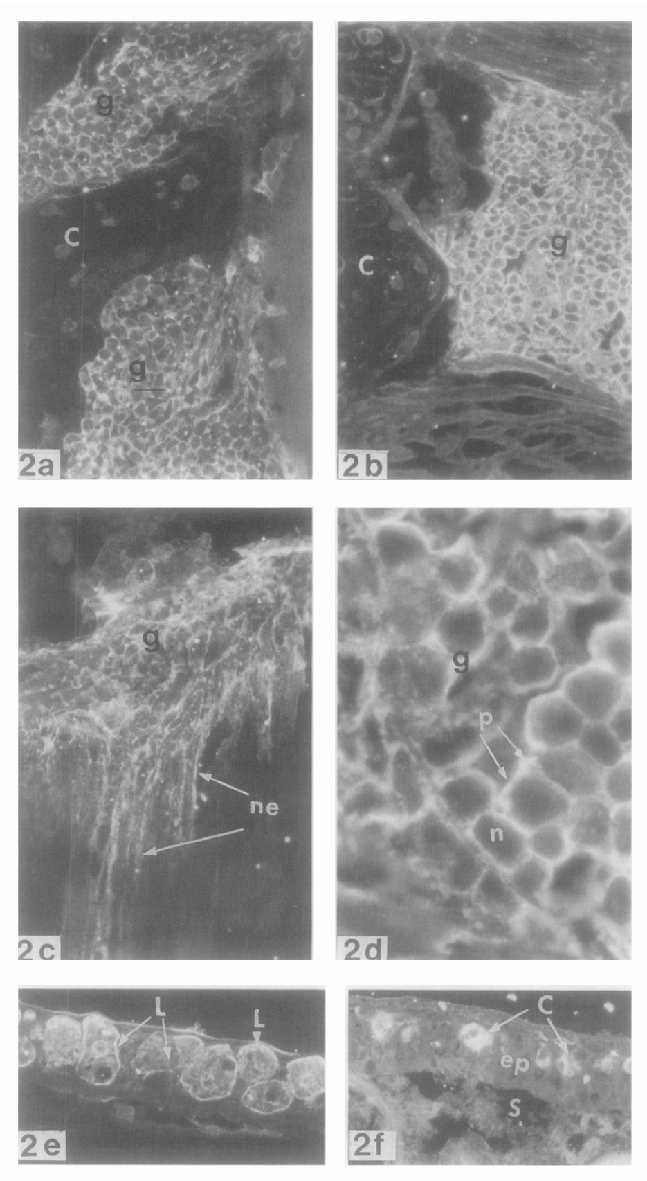 FIG. 2f. Localization of B-EP immunoreactivity in the cells (c), scattered among lining (ep) of the