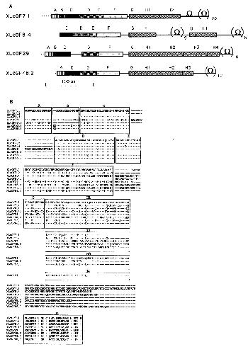 Many DNA-binding proteins that are involved in the differential regulation of gene expression are composed of multiple discrete modules. Association of the homeobox-encoded helix-turn-helix DNA-binding motif with conserved modules, such as the paired box or the POU domain, has led to the definition of structurally and functionally related subfamilies of regulatory proteins. The zinc finger, which is the second major nucleic acid-binding motif characterized to date, defines large multigene families in higher eukaryotes; we have isolated more than 100 Xenopus finger protein-encoding cDNAs and in this study we show that at least 10 of these clones share extensive sequence homologies in a region of more than 200 amino acids in the N-terminal nonfinger portion of the predicted proteins, which is connected to variable finger clusters. We refer to this element as a finger-associated boxes (FAX) domain. Cross-hybridization with human genomic DNA indicates that the finger-associated boxes domain is evolutionary conserved. Northern blot analysis shows that the corresponding genes are differentially expressed in the course of early Xenopus embryogenesis.