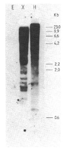 of EcoRI-digested genomic DNA from X. laevis (lane X), Homo