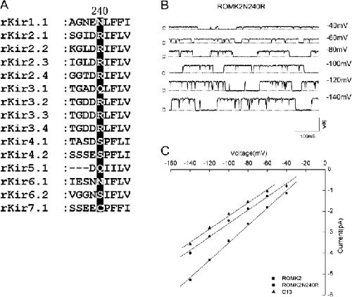 Figure 2. . Single-channel conductance of the N240R mutation. (A) Alignment of the amino acid sequences of the rat Kir channel family, showing sequence differences at positions N240. (B) Inward current traces for the mutant N240R measured in the cell-attached configuration with cell potentials of −40 to −140 mV. Dotted lines indicate the closed state and upward deflections indicate channel openings. (C) I–V relationships for N240R, N240K, and N240E, with data from ROMK2 and C13 shown for comparison. Data represent means ± SEM for at least three different patches. A minimum of 15 transitions at each voltage were measured to obtain values for each patch. The slope conductances measured between −60 and −140 mV were ROMK2, 43 pS; C13, 31 pS; and N240R, 31 pS. |