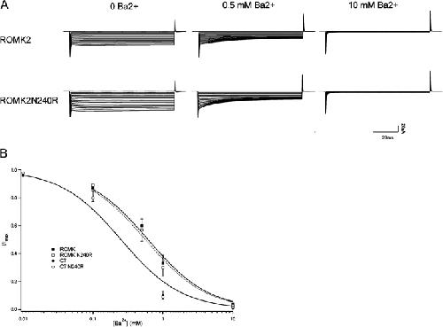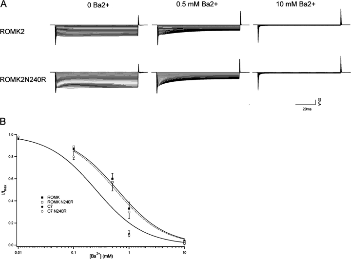 Figure 7. . The N240R mutation does not affect Ba2+ block. Oocytes were superfused with solutions containing 110 mM KCl with and without added Ba2+. Whole-cell currents were measured using the two-electrode voltage-clamp at voltages between 0 and −140 mV. (A) Typical current traces for ROMK2 and ROMK2 N240R with 0, 0.5, and 10 mM Ba2+. (B) Currents at a test potential of −100 mV were normalized to their value in the absence of Ba2+ and plotted vs. Ba2+ concentration. Lines represent fits to a simple titration curve with Ki values of 0.62 mM (ROMK2), 0.56 mM (ROMK2 N240R), 0.25 mM (C7), and 0.25 mM (C7 N240R). |