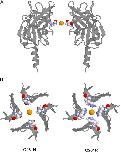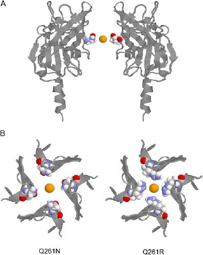 Figure 11. . Model of the effect of N to R substitution in the cytoplasmic pore based on the crystal structure of GIRK1. (A) A side view of the crystal structure of the cytoplasmic domain of GIRK1-Kir3.1 (pdb:1N9P) is shown from the side with two subunits removed for clarity. Residue Q261, corresponding to residue R260 in IRK1-Kir2.1 and N240 in ROMK2-Kir1.1 is highlighted using space-filling mode along with a potassium ion in the same plane and centered along the pore axis. (B) Models of the GIRK1 cytoplasmic domain in which residue Q261 has been mutated to asparagine (left) or arginine (right) are shown here. A cytoplasmic view of the pore-lining residues 223–230, 253–264, and 298–311 is represented with cartoon rendering except for residue 261, which is highlighted using space-filling mode. A potassium ion is shown along the central axis and in the plane of residue 261. |