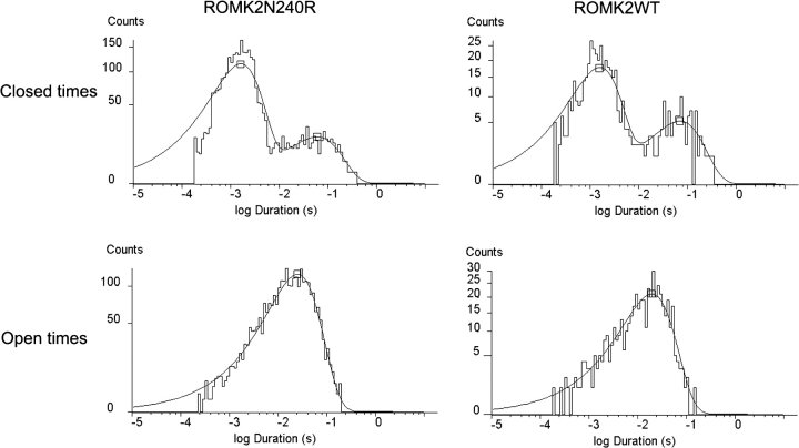 Figure 4. . Kinetic properties of ROMK2 and ROMK2N240R. Currents were recorded from cell-attached patches containing only one channel at a cell potential of −100 mV. Above, closed-time histograms were fit with two exponentials. For ROMK2, the exponentials had time constants of 1.5 ms (77% of closures) and 70 ms (23%). For ROMK2N240R, the exponentials had time constants of 1.7 ms (87%) and 61 ms (13%). Below, open-time histograms were fit with one exponential distribution. Time constants were 20 ms for ROMK2 and 25 ms for N240R. |