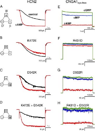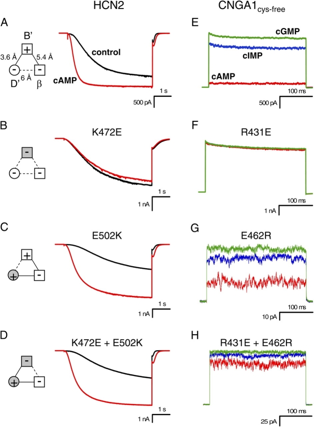 Figure 5. . Mutations of intrasubunit salt bridge. (A–D) Behavior of wild-type HCN2 (A), K472E (B), D542K (C), and K472E + D542K (D) channels. Currents in response to voltage pulses to −130 mV are shown in the absence (black) and presence of saturating cAMP (red). Diagrams to the left show attractive electrostatic interactions by solid lines and repulsive electrostatic interactions by dotted lines with wild-type residues as open symbols and mutant residues as shaded symbols. (E–H) Behavior of CNGA1cys-free (E), R431D (F), D502R (G), and R431D + D502R (H) channels. Current in response to voltage pulses to +100 mV are shown in the presence of saturating cAMP (red), cIMP (blue), and cGMP (green). |