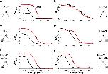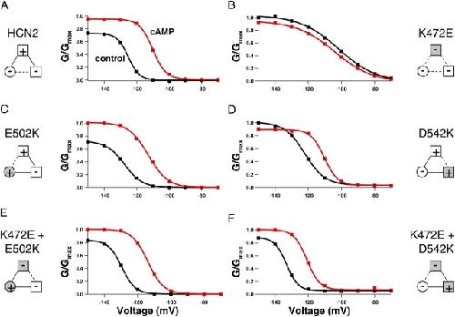 Figure 6. . Conductance–voltage relations for HCN2 channels. (A–F) Conductance versus voltage plots for wild-type HCN2 (A), K472E (B), E502K (C), D542K (D), K472E+E502K (E), and K472E+D542K (F). Each plot indicates GV curves, obtained from normalized tail currents at −40 mV, in the absence (black) and presence of saturating cAMP (red). The data are fit with a Boltzmann relation. Diagrams on the left and the right show attractive electrostatic interactions by solid lines and repulsive electrostatic interactions by a dotted line with wild-type residues as open symbols and mutant residues as shaded symbols. |