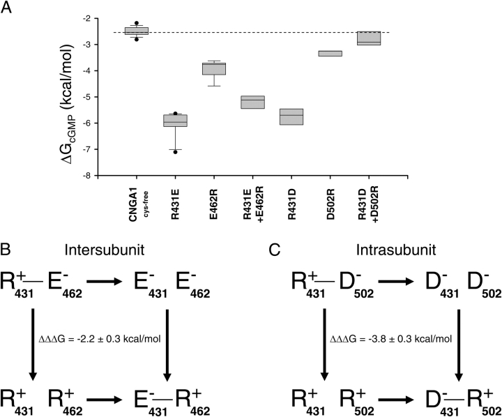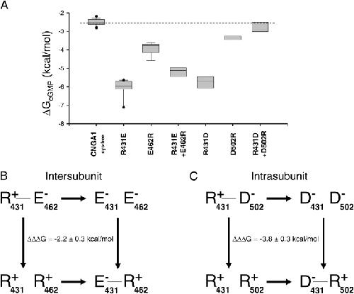Figure 7. . Thermodynamic mutant cycle analysis for CNGA1 channels. (A) Box plot of ΔGcGMP values for CNGA1cys-free and mutant CNGA1 channels. The dashed line indicates the median ΔGcGMP value for CNGA1cys-free. (B and C) Thermodynamic mutant cycles for the intersubunit salt bridge (B) and intrasubunit salt bridge (C). The letters are the amino acid abbreviations for the residues, the number indicates the residue number, and the charge of the residue is also shown. The lines indicate when a salt bridge is possible between residues with opposite charges. ΔΔΔG values were calculated from ΔG values (see materials and methods) and are shown as mean ΔΔΔG ± SEM of ΔΔΔG. |
