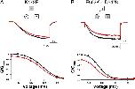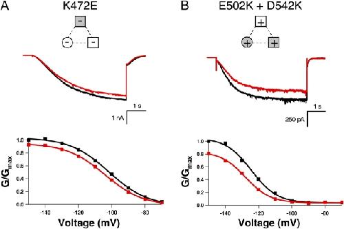 Figure 8. . Double negative-to-positive HCN2 mutant has same phenotype as B' helix site positive-to-negative mutant. Behavior of K472E (A) and E502K+D542K (B) HCN2 channels. Currents in response to voltage pulses to −130 mV, as well as conductance–voltage relations of the normalized conductance from tail currents at −40 mV, are shown in the absence (black) and presence of saturating cAMP (red). Diagrams at the top of each column show attractive electrostatic interactions by solid lines and repulsive electrostatic interactions by dotted lines with wild-type residues as open symbols and mutant residues as shaded symbols. The GV curves are fit with a Boltzmann relation. |