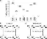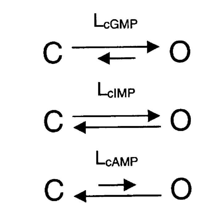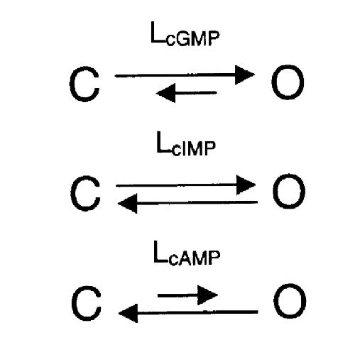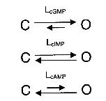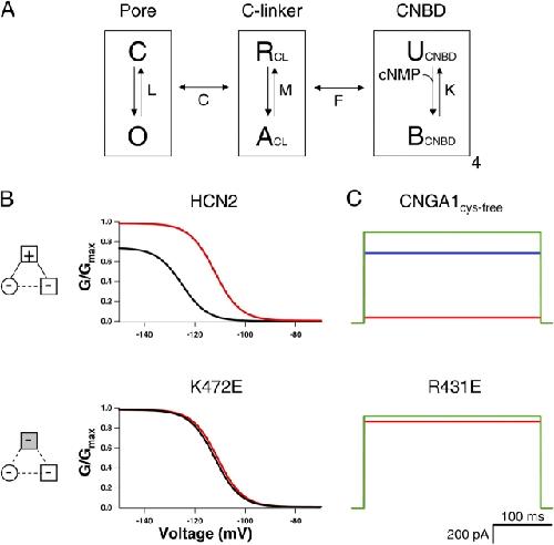 Figure 9. . Model of modular gating scheme for HCN and CNG channels. (A) HCN and CNG gating model with three modules: pore, C-linker, and CNBD. Each module is represented by a boxed equilibrium, indicating that each module can be in one of two configurations. Pore can be closed (C) or open (O), C-linker can be resting (R) or activated (A), and CNBD can be unbound (U) or bound (B) with ligand. Equilibrium constants are shown for each module: L for pore, M for C-linker, and K for CNBD. The pore and the C-linker influence each other through allosteric factor C, and the C-linker and CNBD through allosteric factor F. (B) Simulated conductance–voltage (GV) relations for wild-type (top) and K472E (bottom) HCN2 channels in the absence (black) and presence of saturating cAMP (red). A voltage-dependent module that was coupled to the pore was added for these calculations. The values of the parameters used are shown in the materials and methods. (C) Simulated current traces in response to voltages for CNGA1cys-free (top) and R431E (bottom) channels in the presence of saturating cAMP (red), cIMP (blue), and cGMP (green). For the R431E simulations, the current values for cIMP are so similar to cGMP that the two traces overlay. Diagrams to the left show attractive electrostatic interactions by solid lines and repulsive electrostatic interactions by dotted lines with wild-type residues as open symbols and mutant residues as shaded symbols. |