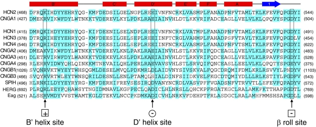 Figure 3. . Sequence alignment of COOH-terminal regions from HCN, CNG, and related channels. Sequence alignment of the COOH-terminal region includes all members of the CNG channel family (bovine CNGA1, rat CNGA2, bovine CNGA3, rat CNGA4, bovine CNGB1, murine CNGB3) and HCN channel family (murine HCN2, mouse HCN1, rat HCN3, rat HCN4), as well as SPIH (the sea urchin sperm homologue of HCN), and the human ether-a-go-go related gene (HERG) and Drosophila Eag K+ channels. Above the sequence alignment, the tertiary structure elements are shown: α-helices (red rectangles), β-sheets (blue arrow), and uncoiled regions (line). Residues highlighted in blue are similar. Putative salt bridge residues studied are boxed and labeled. |
