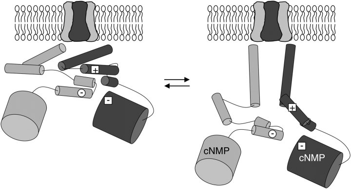 Figure 10. . Model for COOH-terminal region in the resting and activating configurations. Cartoons of HCN2 COOH-terminal region from the side view, both in the resting configuration (left) and the active configuration (right). COOH-terminal regions of two subunits (dark and light gray) are shown below the membrane-spanning portion of the channel. α helices are shown with narrow cylinders, and the β rolls of the CNBDs are shown with wide cylinders. Salt bridge residues are shown: the positive B' helix residue (plus sign within a square) and the two negative residues on the D' helix and the β roll (minus signs within a circle or square, respectively). |