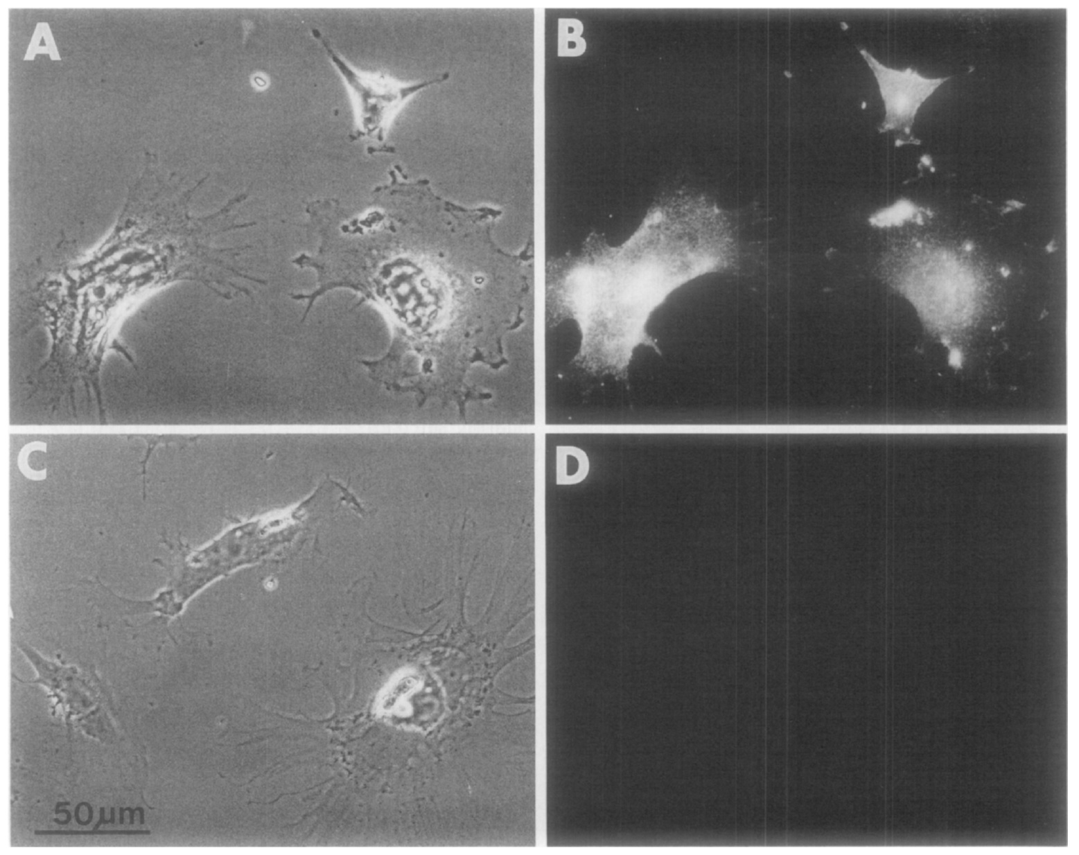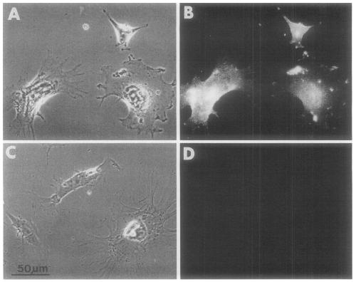 FIG. 1. Antibody labeling of XRl cells by XAG2 (A, B) and XAN3 (C, D). (A, C) Phase photomicrographs of the fluorescence photographs in B