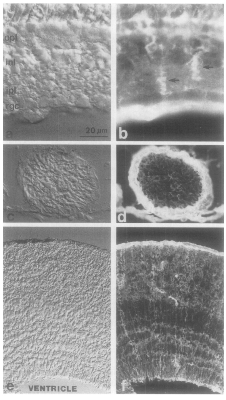 among the optic fibers. (E, F) Section of tadpole optic tectum labeled