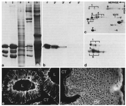 in the lamina propria with antibodies to various cytoskeletal a-d and junctional proteins e, f. Symbols as in Fig. 2. a The axons