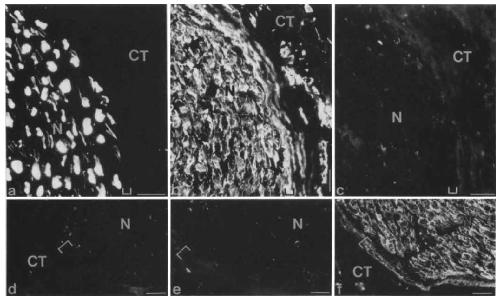 Fig. 8a-f. Immunofluorescence microscopy of frozen cross-sections of human optic nervc, using antibodies to different IF proteins
