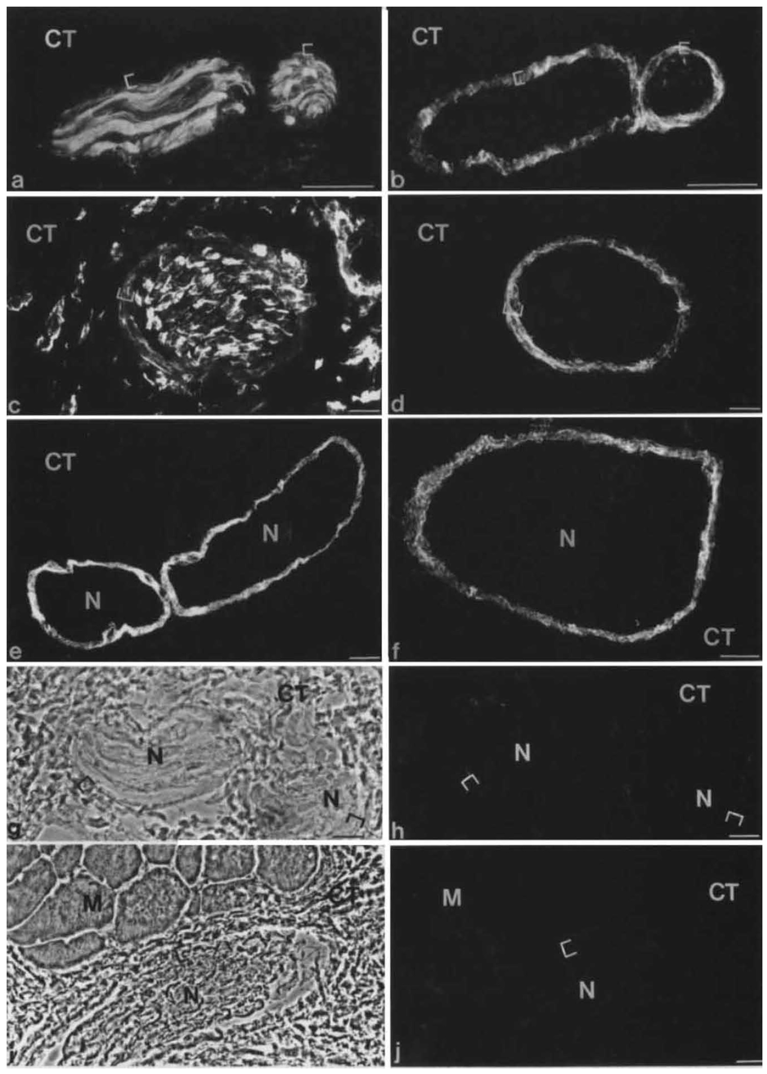 showing specific localization of desmosomes in the perineurium (brackets). All bars, 20 pm |