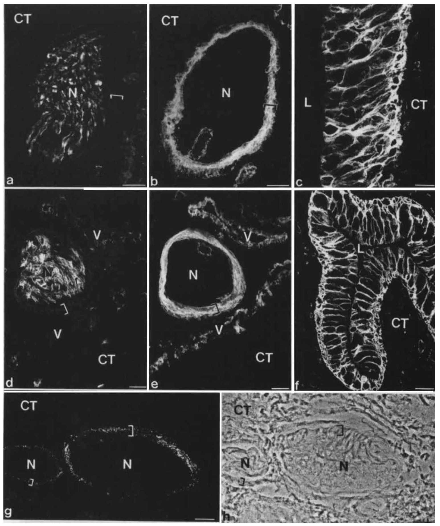 Fig. 3a-h. Immunofluorescence microscopy of frozen sections through the esophageal wall of Xenopus laeuis (for details see [W])u,s ing