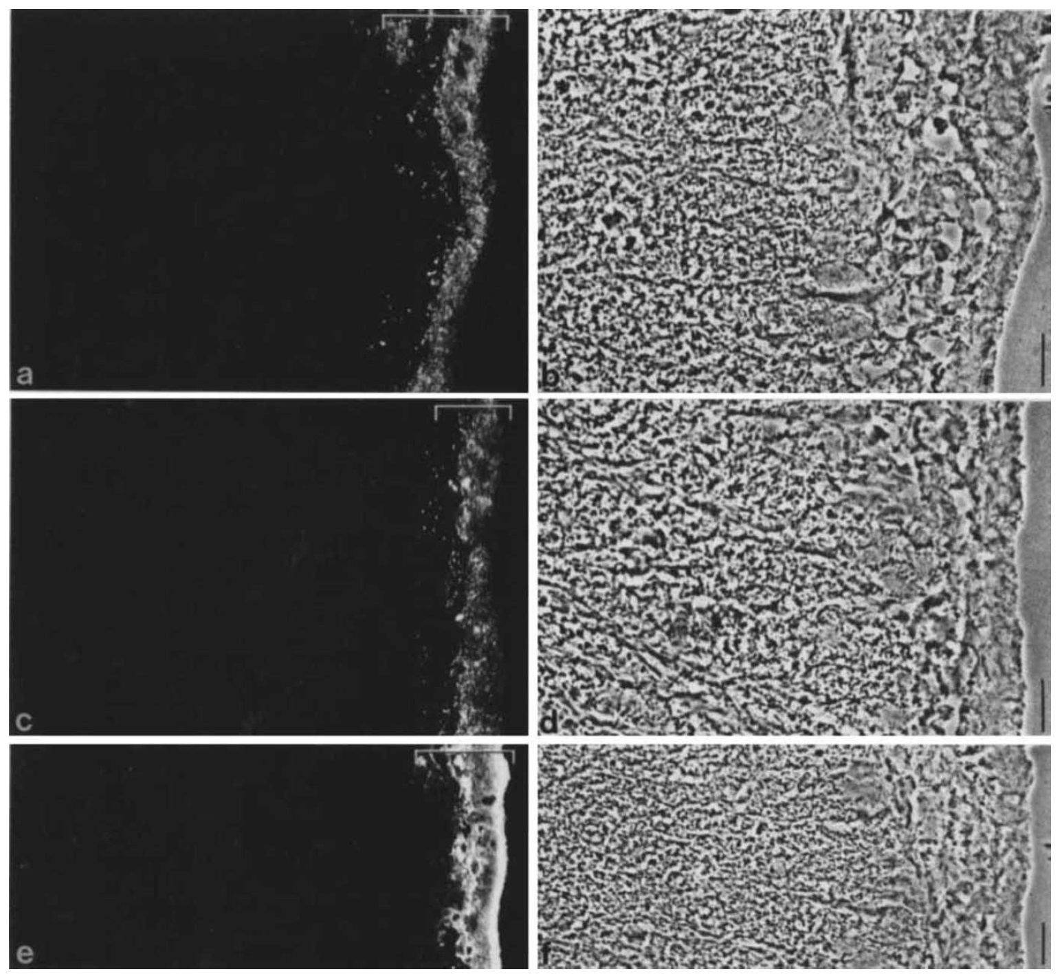 Fig. 7a-e. Immunofluorescence microscopy of cross sections of amphibian (Xenopus laeuis) spinal cord, using monoclonal desmoplakin