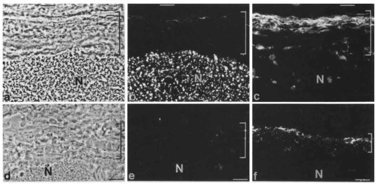 of cytokeratin antibodies (d, phasecontrast optics; e, epifluorescence) is negative on both the nerve interior and the arachnoidal cell