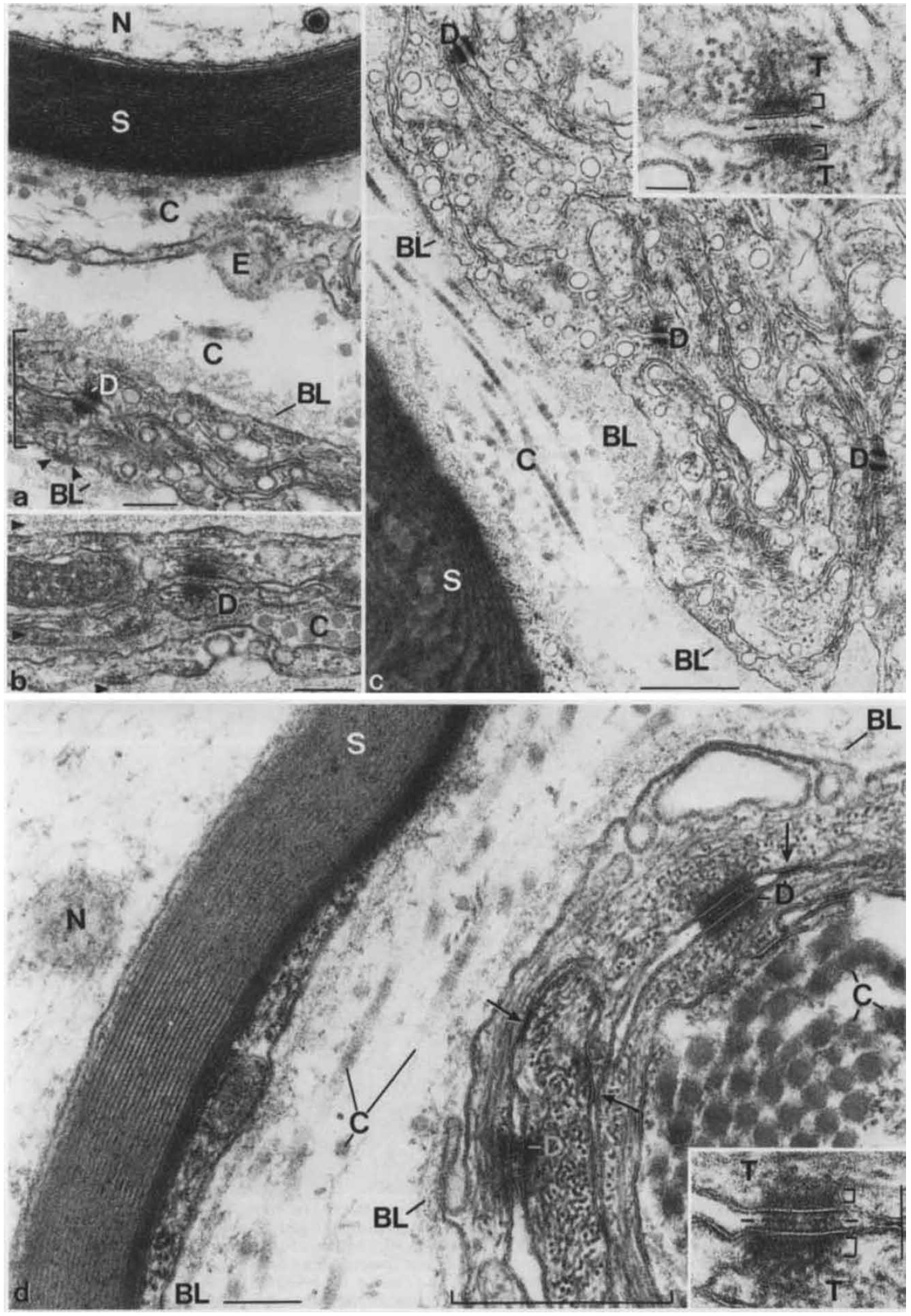 can be associated, on either side, with basal lamina-like material (arrows; denoted BL in the inserr) and collagen fibers (C), often